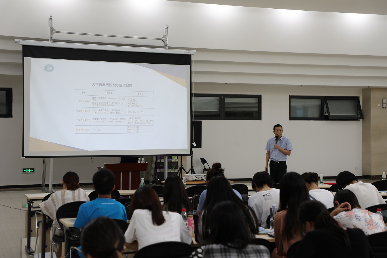 讲座伊始,杨老师首先以分析近年来就业形势为切入点,为同学们讲述了未来求职过程中将会面对的巨大压力。接下来,杨老师针对大学期间容易出现的“迷糊、迷茫、迷惑、迷失”给出了一些建议,即“明确方向、寻找兴趣、管理时间、端正态度、发现自己、相信自己、证明自己、提高自己”。