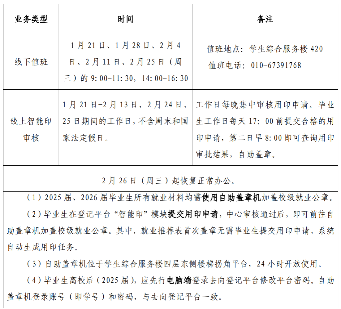 根据学校寒假放假安排,现将就业创业指导中心2026年寒假期间值班安排通知如下: